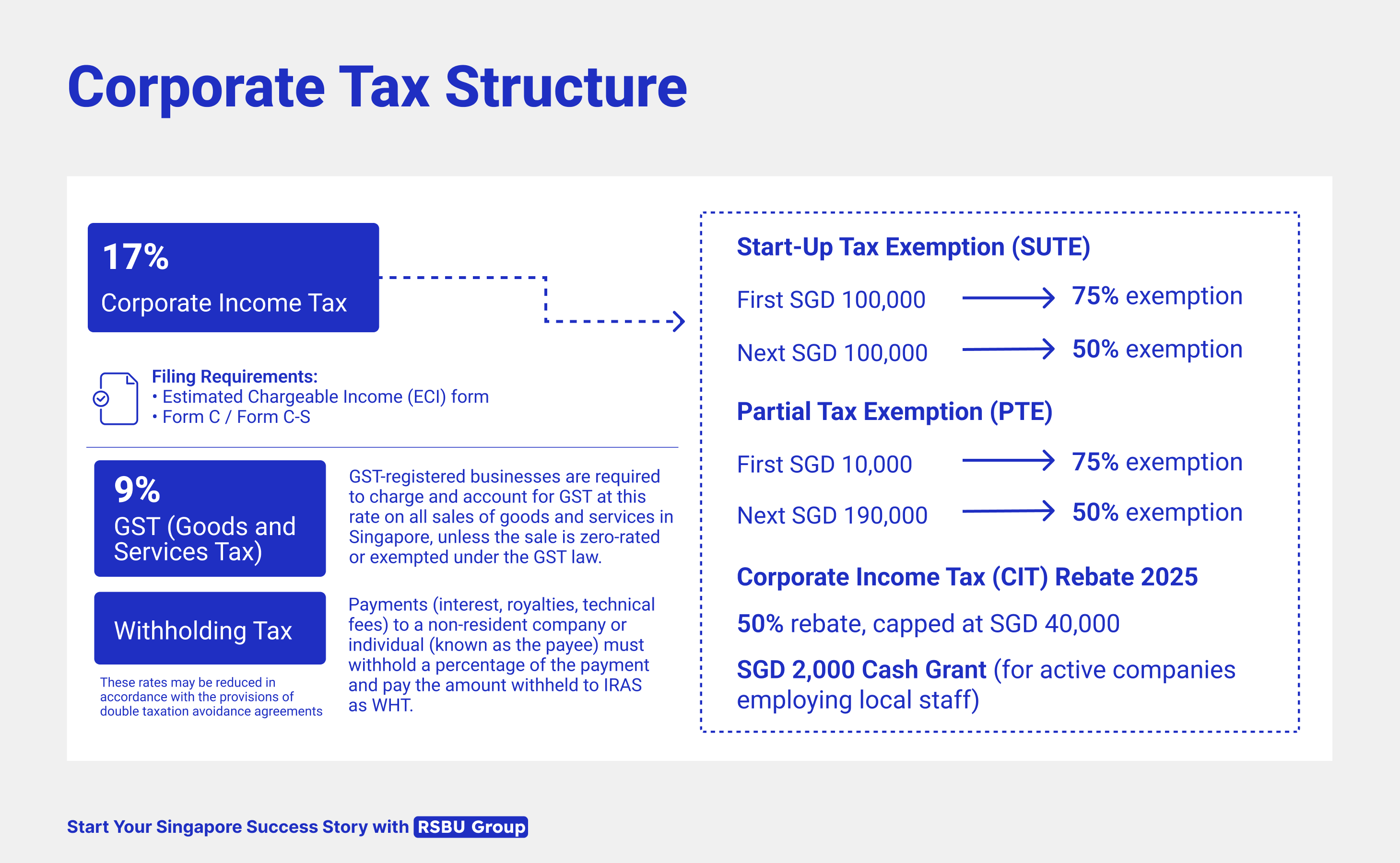 - Singapore’s corporate income tax rate remains highly competitive at 17%, with additional incentives such as partial tax exemptions of 75% on the first SGD 10,000 and 50% on the next SGD 190,000 of taxable income for all companies.